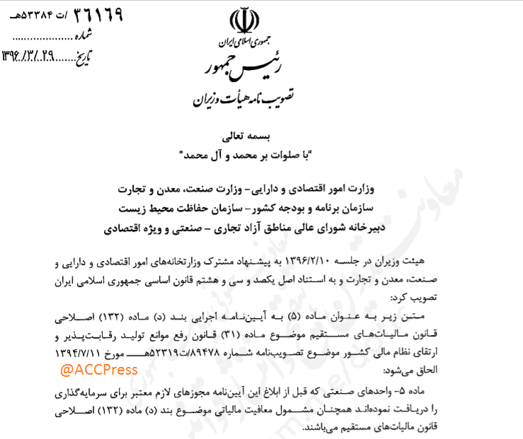 درقالب مصوبه هیات وزیران ، متن موردنظر به عنوان ماده (۵) به آيين نامه اجرايي بند (د) ماده (۱۳۲) اصلاحي قانون ماليات هاي مستقيم موضوع ماده (۳۱) قانون رفع موانع توليد الحاق شد.