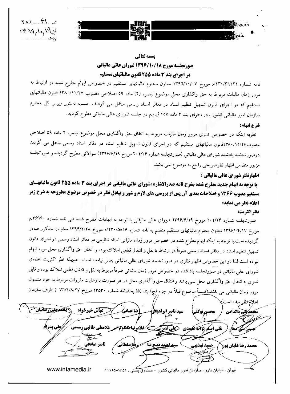 نظریه شورای عالی مالیاتی در خصوص مرور زمان مالیاتی نسبت به حق واگذاری محل موضوع تبصره ۲ ماده ۵۹ اصلاحیه قانون مالیاتها اعلام شد.