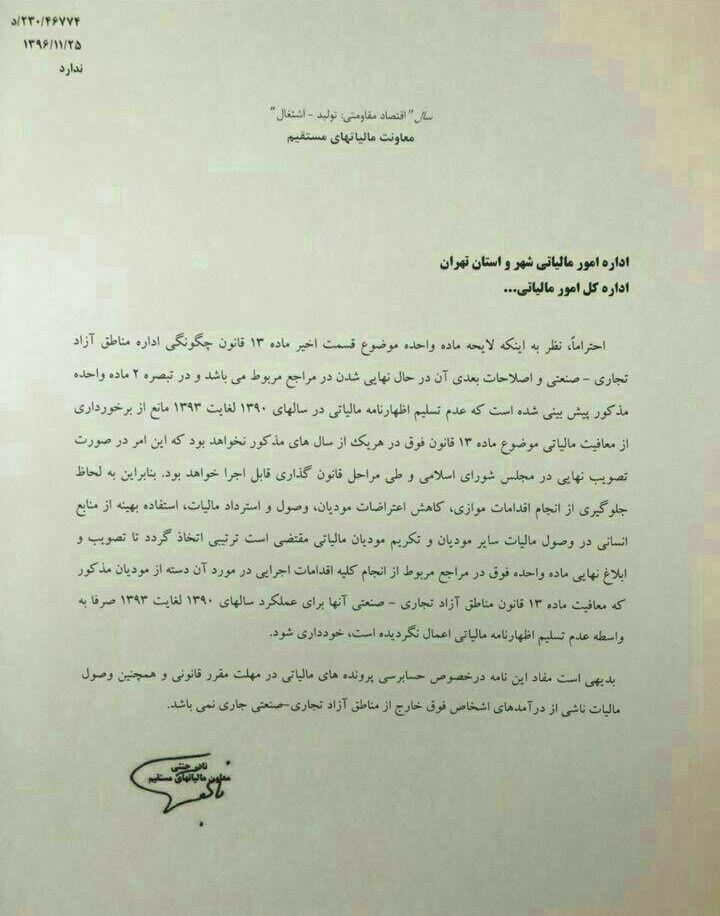 بخشنامه ۲۳۰/۴۶۷۷۴مورخ۹۶/۱۱/۲۵ (توقف عملیات اجرایی رسیدگی مالیاتی ) آيین نامه هاي قانون مالیاتهاتازه های امور مالیاتی در اسفند 26, 1396 0 1,893 به اشتراک گذاری دستور توقف عملیات اجرایی رسیدگی مالیاتی سال های ۱۳۹۰ تا ۱۳۹۳ مشمولین ماده ۱۳ قانون مناطق آزاد تجاری تا اطلاع ثانوی صادرشد. [br] [br] [hr] توقف عملیات اجرایی رسیدگی مالیاتیماده 13 قانون مناطق آزاد تجاری 0 1,893 به اشتراک گذاری