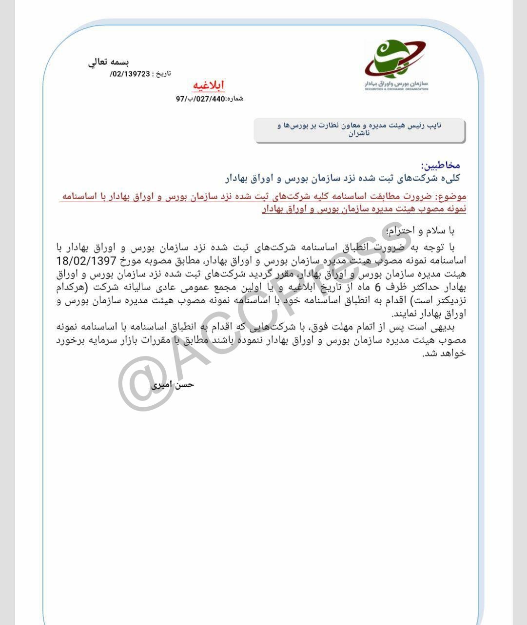 ضرورت مطابقت اساسنامه کلیه شرکتهای ثبت شده نزد سازمان بورس بورس اوراق بهادارتازه هاي بازار سرمايه در خرداد 7, 1397 0 1,820 به اشتراک گذاری بنا به بخشنامه سازمان بورس و اوراق بهادار ، به ضرورت مطابقت اساسنامه کلیه شرکتهای ثبت شده نزد سازمان بورس و اوراق بهادار با اساسنامه نمونه مصوب هیئت مدیره سازمان بورس و اوراق بهادار تاکیدشد. [br] [br] [hr] 0 1,820 به اشتراک گذاری