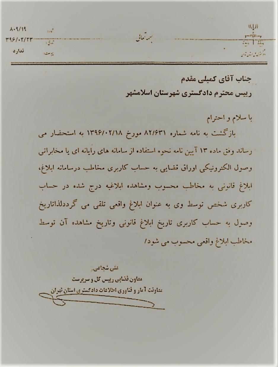 شرایط ابلاغ اوراق قانونی در قالب سامانه پیامکی سایر قوانینقوانين عمومي در مرداد 6, 1397 0 1,021 به اشتراک گذاری دادگستری استان تهران در پاسخ به مکاتبه ای ، شرایط ابلاغ اوراق قانونی منجمله اوراق مالیاتی در قالب سامانه پیامکی را تشریح کرد. [br] [br] [hr] شرایط ابلاغ اوراق قانونی در قالب سامانه پیامکی 0 1,021 به اشتراک گذاری
