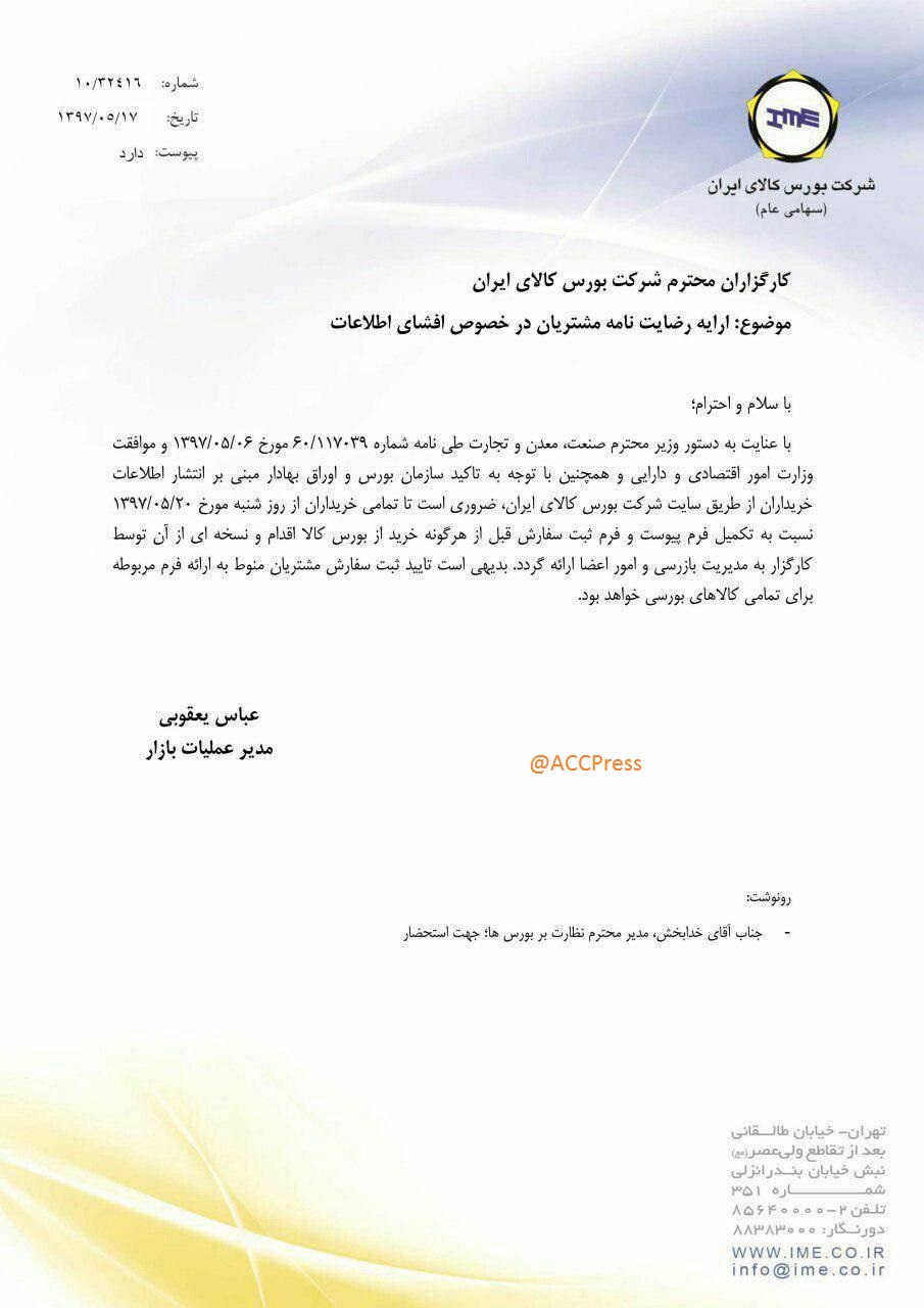 نحوه افشا اطلاعات خریداران در بورس کالای ایران اخبار اقتصادياخبار مجامع حرفه اي در مرداد 23, 1397 0 930 به اشتراک گذاری شرکت بورس کالای ایران ، نحوه افشا اطلاعات خریداران در بورس کالای ایران را اعلام کرد. [br] [br] [hr] افشا اطلاعات خریداراننحوه افشا اطلاعات خریداران در بورس کالای ایران 0 930 به اشتراک گذاری