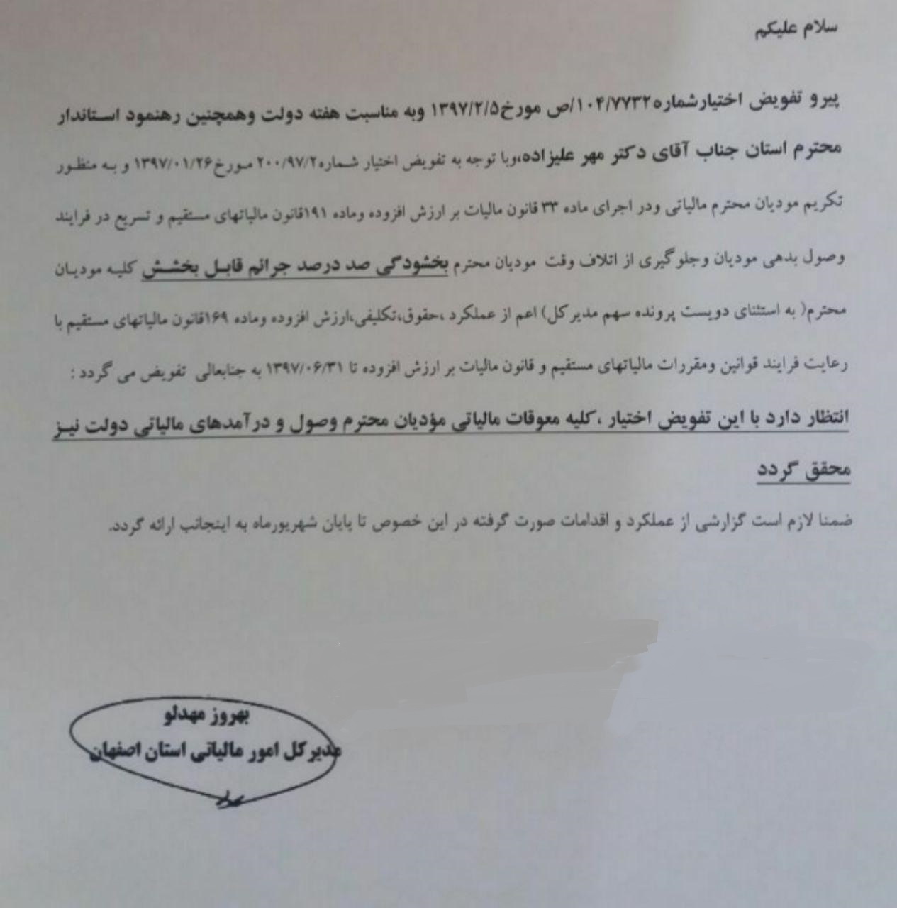 در این نامه آمده است: پیرو تفویض اختیار شماره 7732/ ۱۰۴/ ص مورخ ۵/۲/ ۱۳۹۷ و به مناسبت هفته دولت و همچنین رهنمود استاندار استان اصفهان، مهر علیزاده و با توجه به تفویض اختیار شماره ۲/ ۹۷/ ۲۰۰ مورخ ۲۶/ ۰۱/ ۱۳۹۷ و به منظور تکریم مودیان محترم مالیاتی و در اجرای ماده ۳۳ قانون مالیات بر ارزش افزوده و ماده ۹۱ قانون مالیاتهای مستقیم و تسریع در فرایند وصول بدهی مودیان و جلوگیری از اتلاف وقت مودیان محترم بخشودگی صددرصد جرائم قابل بخشش کلیه مودیان محترم (به استثنای دویست پرونده سهم مدیرکل) اعم از عملکرد، حقوق، تکلیفی، ارزش افزوده و ماده ۱۶۹ قانون مالیاتهای مستقیم با رعایت فرایند قوانین و مقررات مالیاتهای مستقیم و قانون مالیات بر ارزش افزوده تا ۳۱/۰۶/۱۳۹۷ به جنابعالی تفویض میگردد: