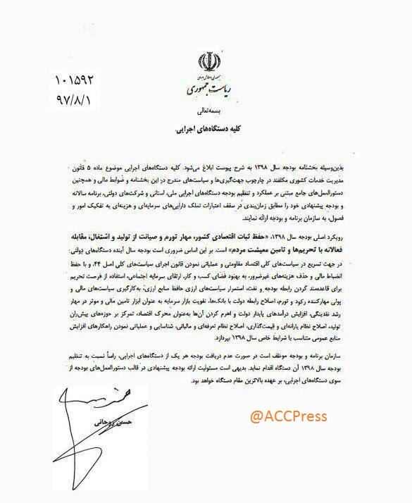 رييس جمهور بخشنامه بودجه سال ۱۳۹۸ كل كشور به تمامی دستگاههای اجرايی ابلاغ کرد.