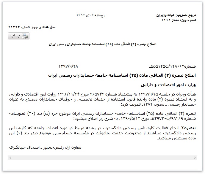 اصلاح اساسنامه جامعه حسابداران رسمی در خصوص فعالیت کارشناس رسمی دادگستری اخبار مجامع حرفه ايجامعه حسابداران رسمی در دی 26, 1397 0 2,813 به اشتراک گذاری هیات وزیران اصلاح اساسنامه جامعه حسابداران رسمی در خصوص فعالیت کارشناس رسمی دادگستری را ابلاغ کرد. [br] [br] [hr] اساسنامه جامعه حسابداران رسمی ایراناساسنامه جامعه حسابداران رسمی ایران تغییر یافتاساسنامهی جامعه حسابدارن رسمیتبصرهی (3) ماده (25) اساسنامهی جامعه حسابدارن رسمیفعالیت کارشناس رسمی حسابداران رسمیکارشناس رسمی حسابدار رسمیکارشناس رسمی حسابداران رسمی 0 2,813 به اشتراک گذاری