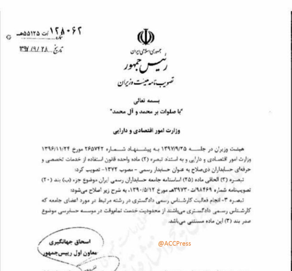 بنابراین برای رفع شبهه و جلوگیری از مطالبه مالیات مضاعف از یک فعالیت واحد، هیئت وزیران در جلسه ۲۵ /۹ /۱۳۹۷ به پیشنهاد وزارت امور اقتصادی و دارایی و به استناد تبصره (۲) ماده واحده قانون استفاده از خدمات تخصصی و حرفهای حسابداران ذیصلاح به عنوان حسابدار رسمی -مصوب ۱۳۷۲- تبصره (۳) الحاقی ماده (۲۵) اساسنامه جامعه حسابداران رسمی ایران موضوع جزء (ب) بند (۲۰) تصویبنامه شماره ۹۸۴۶۹/ت ۳۹۷۳۰ هـ مورخ ۱۲ /۵ /۱۳۹۰ را به شرح زیر اصلاح نمود: