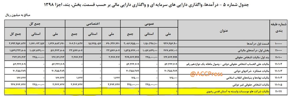 به گزارش خبرآنلاین، در جدول شماره ۵ که درآمدها ، واگذاری داراییهای سرمایهای و واگذاری دارایی مالی را شامل می شود، مالیات شرکتها و موسسات وابسته به آستان قدس رضوی یک میلیون ریال برابر با صد هزار تومان پیش بینی شده است .این بدان معنی نیست که مالیات شرکت های آستان قدس رضوی در سال آینده صد هزار تومان است ، بلکه به دلیل مشخص نبودن میزان مالیات پرداختی این عدد در جدول بودجه سال آینده پیش بینی شده است.