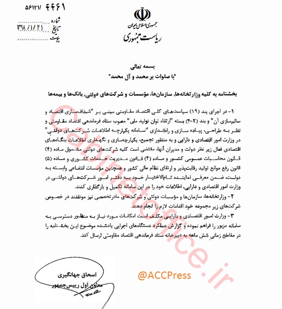 به گزارش «پایگاه اطلاع رسانی دفتر هیئت دولت» اسحاق جهانگیری، معاون اول رئیس جمهور با ارسال بخشنامهای، کلیه شرکتهای دولتی مشمول ماده (۴) قانون محاسبات عمومی کشور و ماده (۴) قانون مدیریت خدمات کشوری و ماده (۵) قانون رفع موانع تولید رقابتپذیر و ارتقای نظام مالی کشور و همچنین مؤسسات انتفاعی وابسته به دولت را ملزم کرد تا ضمن معرفی نماینده تامالاختیار خود به دفتر امور شرکتهای دولتی در وزارت امور اقتصادی و دارایی، اطلاعات خود را در “سامانه یکپارچه اطلاعات شرکتهای دولتی” تکمیل و بارگذاری کنند.