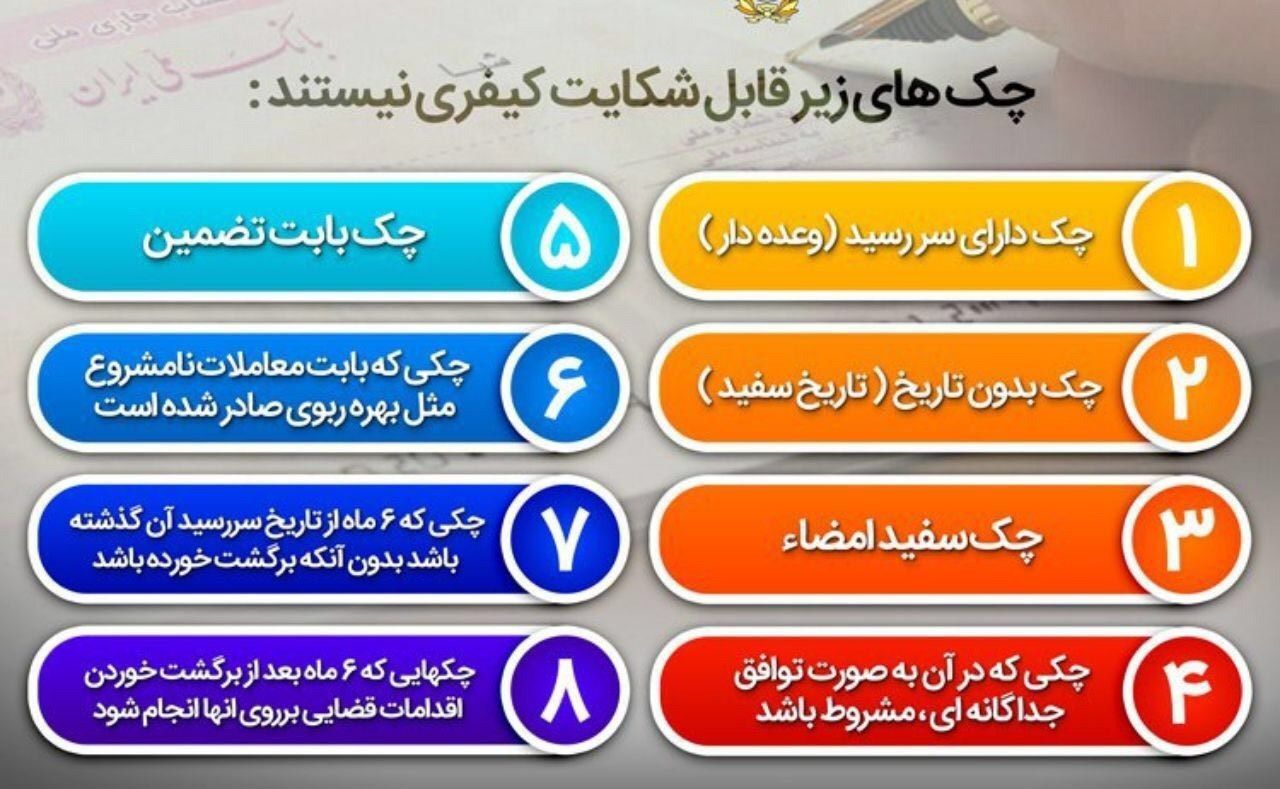 کدام چکهای غیرقابل شکایت کیفری هستند اخبار اقتصادياخبار مجامع حرفه اي در اردیبهشت 28, 1398 0 1,480 به اشتراک گذاری ۱- چک دارای سر رسید (وعده دار) یعنی چکی که برای تاریخ آینده صادر شده باشد. [br] [br] [hr] برگشت چکچک کیفریشکایت چککدام چکها قابل شکایت کیفری 0 1,480 به اشتراک گذاری