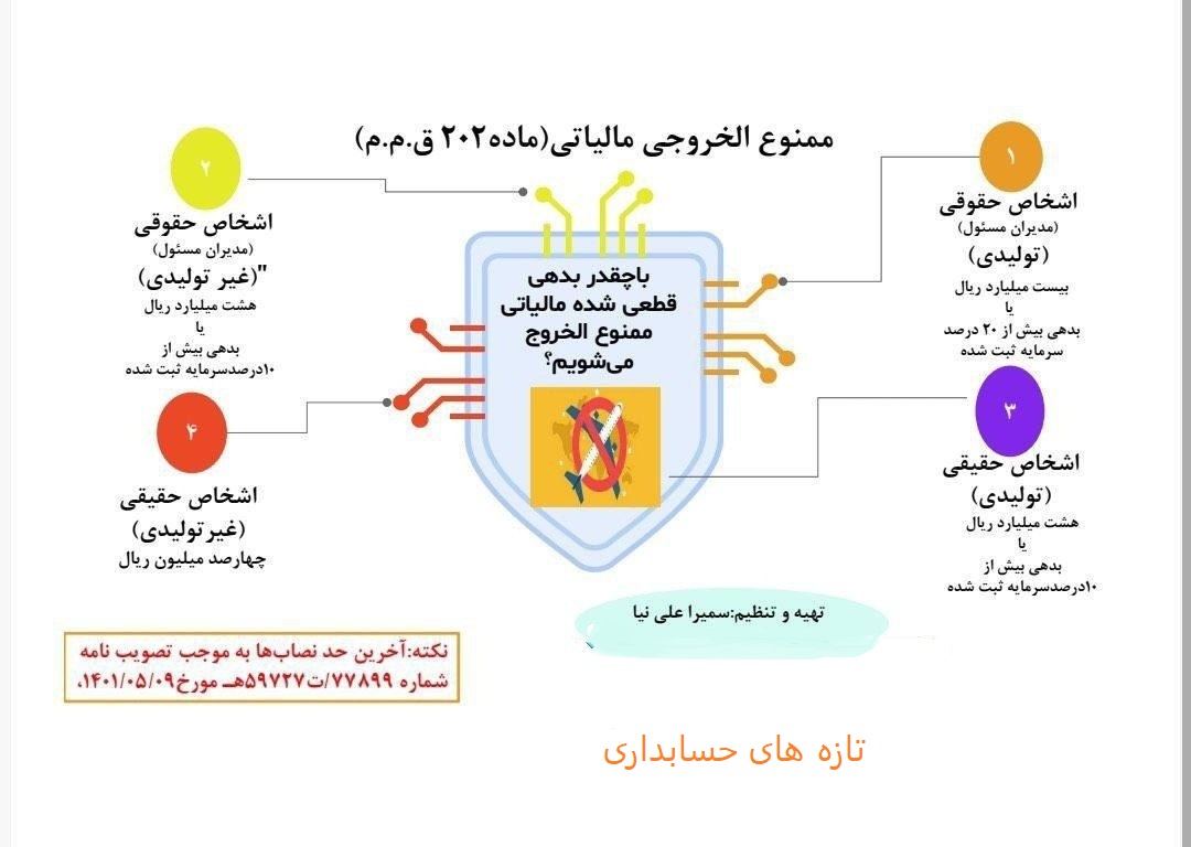 باتوجه به تعدیل حد نصابهای قانون مالیاتها براساس تصویب نامه اخیرهیات وزیران شرایط ممنوع الخروجی مالیاتی(ماده ۲۰۲ قانون مالیاتها) به شرح زیر می باشد: