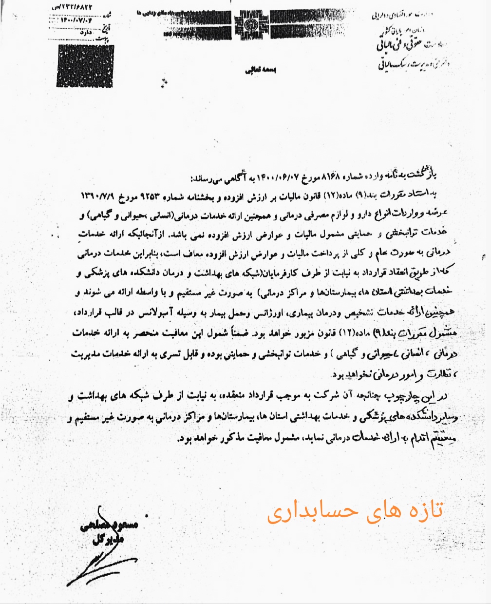 حمل بیمار بوسیله آمبولانس مشمول مالیات ارزش افزوده می باشد؟! آيين نامه ماليات ارزش افزودهتازه های امور مالیاتی در آبان 17, 1403 0 306 به اشتراک گذاری خدمات حمل بیمار بوسیله آمبولانس معاف از مالیات بر ارزش افزوده می باشد. شماره 232/6822مالیات بر ارزش افزوده 0 306 به اشتراک گذاری