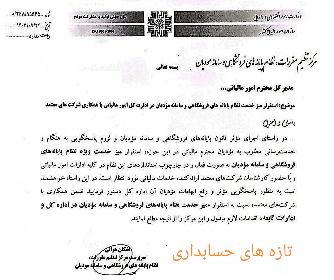 استقرار میز خدمت در ادارات مالیاتی کشور آيین نامه هاي قانون مالیاتهااخبار امور مالياتياخبار مجامع حرفه اي در آذر 30, 1403 0 176 به اشتراک گذاری میز خدمت نظام پایانههای فروشگاهی و سامانه مودیان در ادارات مالیاتی کشوربا همکاری شرکت های معتمد مستقر میشوند. سامانه مودیانشماره 268/71645نظام پایانههای فروشگاهی 0 176 به اشتراک گذاری