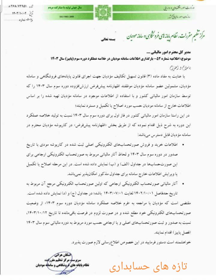 اطلاعیه شماره ۵۲ در خصوص بارگذاری اطلاعات سامانه مودیان در خلاصه عملکرد دوره سوم (پاییز) منتشرشد.