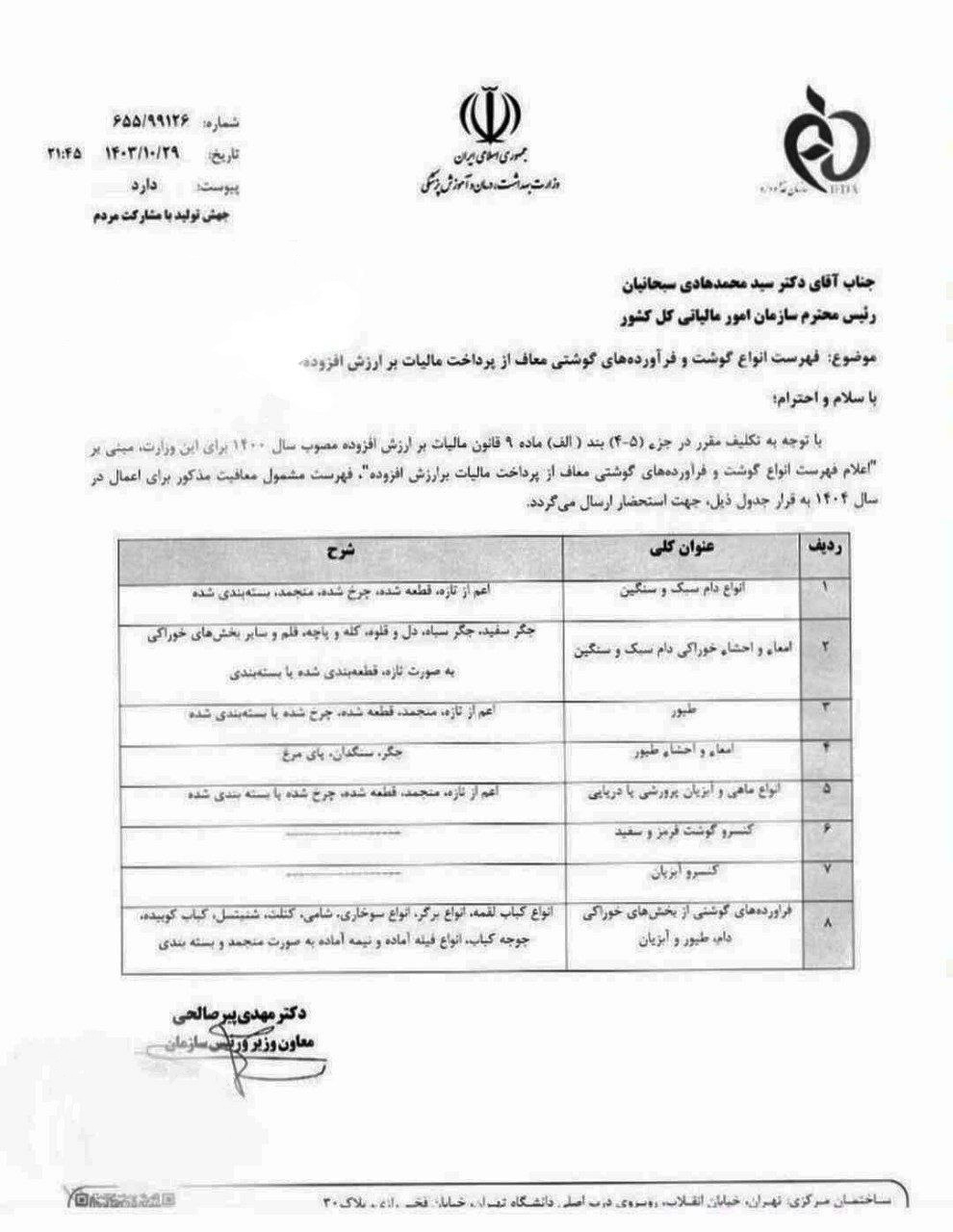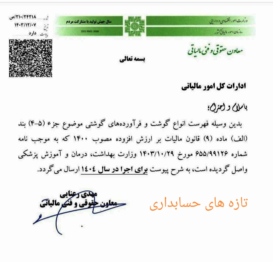 اعلام فهرست انواع گوشت و فرآورده های گوشتی معاف از مالیات بر ارزش افزوده آيين نامه ماليات ارزش افزودهتازه های امور مالیاتی در اسفند 12, 1403 0 387 به اشتراک گذاری فهرست انواع گوشت و فرآورده های گوشتی معاف از مالیات بر ارزش افزوده برای سال ۱۴۰۴ بر اساس نامه وزارت بهداشت اعلام شد. شماره 210/24218مالیات بر ارزش افزودهوزارت بهداشت 0 387 به اشتراک گذاری