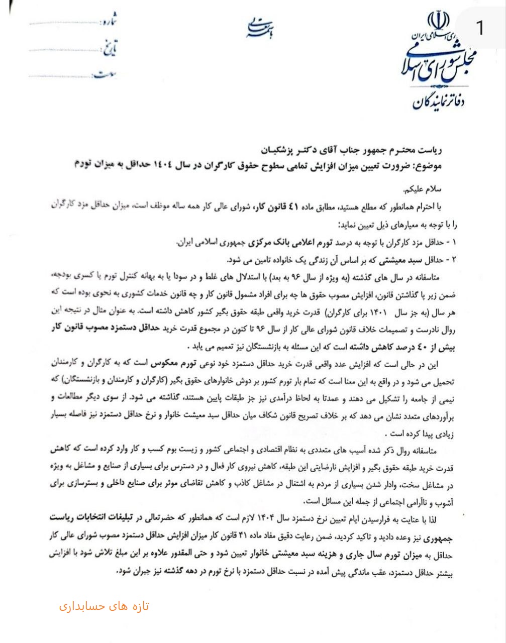 نامه نمایندگان مجلس به رییس جمهور در مورد ضرورت افزایش حقوق کارگران اخبار اقتصادياخبار مجامع حرفه اي در اسفند 14, 1403 0 105 به اشتراک گذاری بیش از ۱۵۰ نماینده مجلس در نامه ای به رییس جمهور در مورد ضرورت افزایش همه سطوح حقوق کارگران حداقل به میزان تورم در سال ۱۴۰۴ و جبران عقب ماندگیهای سالهای قبل هشدار دادند. حداقل دستمزد ۱۴۰۴حقوق کارگران 1404دستمزد ۱۴۰۴مزد 1404 0 105 به اشتراک گذاری