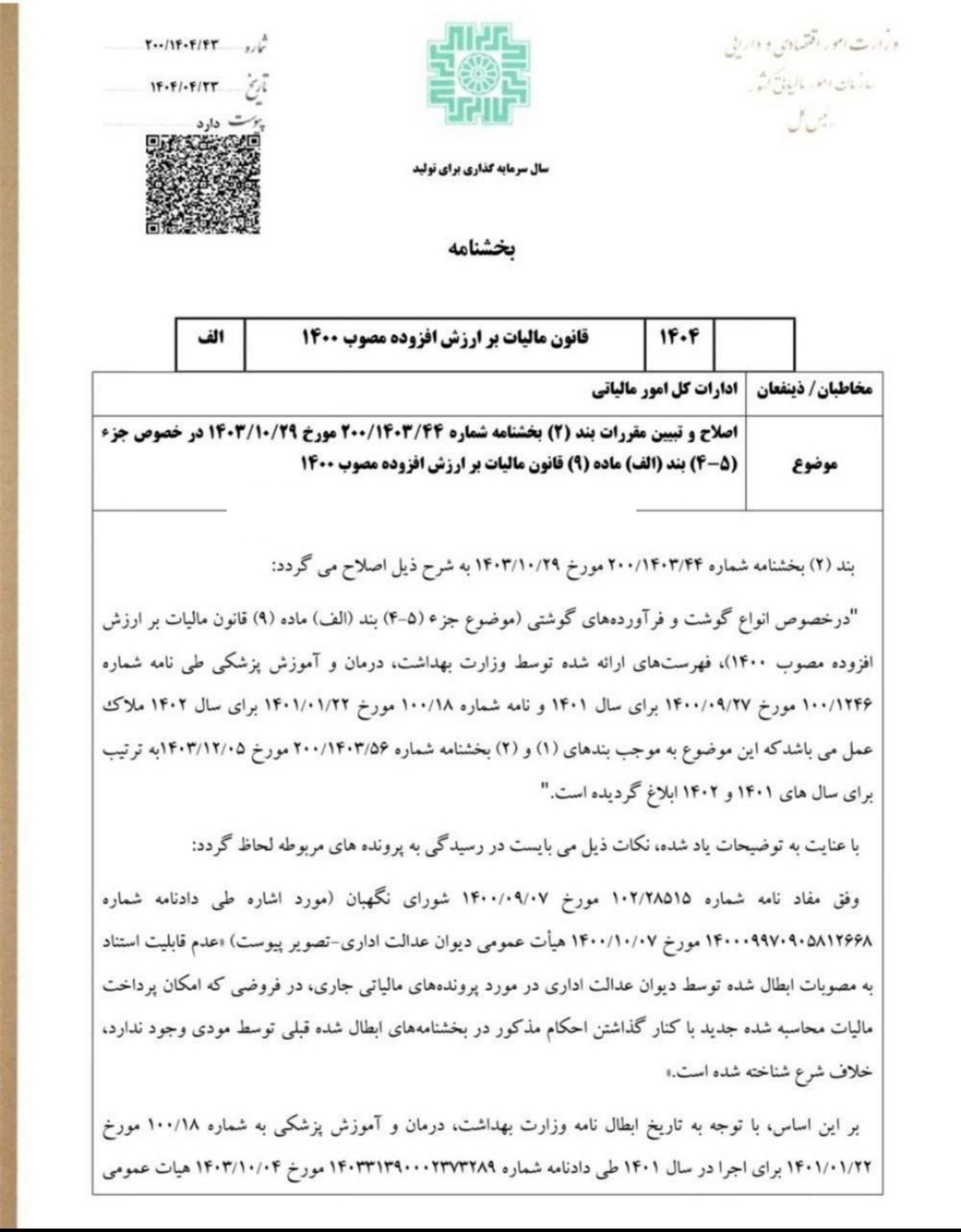 اصلاحیه مذکور در خصوص فهرست انواع گوشت و فرآورده های گوشتی موضوع جزء (۵-۴) بند (الف) ماده (۹) قانون مالیات بر ارزش افزوده مصوب ۱۴۰۰ می باشد.