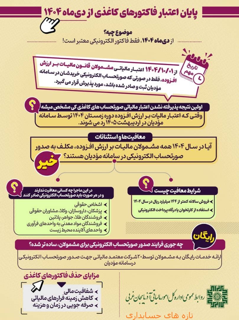 اطلاعیه سازمان امور مالیاتی در خصوص صورتحساب های الکترونیکی اخبار امور مالياتياخبار مجامع حرفه اي در شهریور 11, 1404 0 354 به اشتراک گذاری از تاریخ ۱۴۰۴/۱۰/۰۱ اعتبار مالیاتی مستند به صورتحساب های الکترونیکی ثبت شده در سامانه مودیان قابل قبول خواهد بود. اعتبار مالیاتیسامانه مودیان 0 354 به اشتراک گذاری