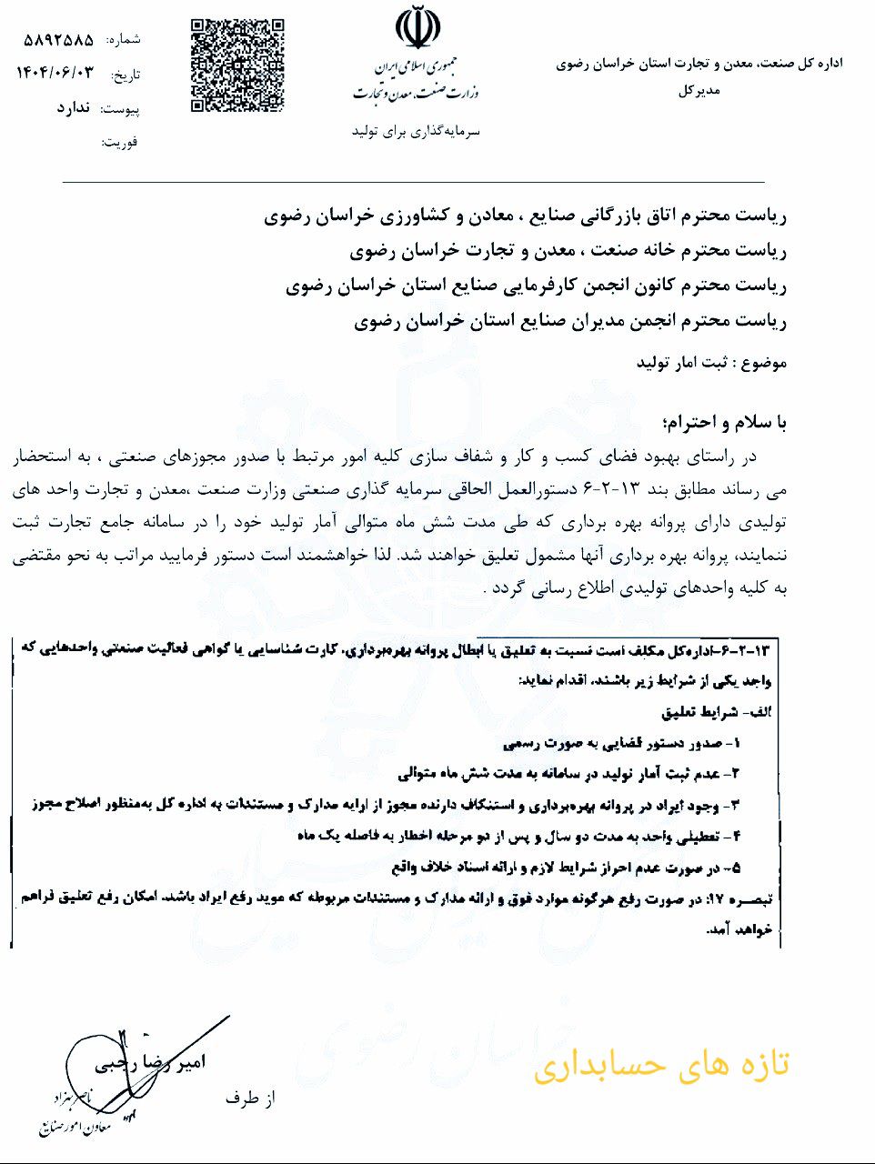 درچه صورت پروانه بهره برداری واحدهای تولیدی معلق میشود؟ اخبار برگزیدهاخبار مجامع حرفه ايسایر قوانین در شهریور 12, 1404 0 128 به اشتراک گذاری تعلیق پروانه بهره برداری واحدهای تولیدی که طی مدت شش ماه متوالی آمار تولید خود را در سامانه جامع تجارت ثبت ننمایند. سامانه جامع تجارتشماره 5892585 0 128 به اشتراک گذاری