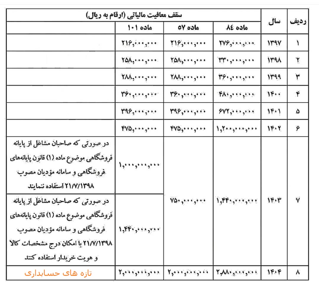 سقف معافیت مالیاتی سنوات ۱۳۹۷ لغایت ۱۴۰۴ قانون مالیات های مستقیم اخبار امور مالياتياخبار مجامع حرفه اي در شهریور 16, 1404 0 97 به اشتراک گذاری سقف معافیت مالیاتی سنوات ۱۳۹۷ لغایت ۱۴۰۴ قانون مالیات های مستقیم بدین شرح می باشد: ماده ۸۴ – حقوق ماده ۵۷ – صاحبان املاک اجاری ماده ۱۰۱ – صاحبان مشاغل معافیت مالیات اجارهمعافیت مالیات حقوقمعافیت مالیات صاحبان مشاغل 0 97 به اشتراک گذاری