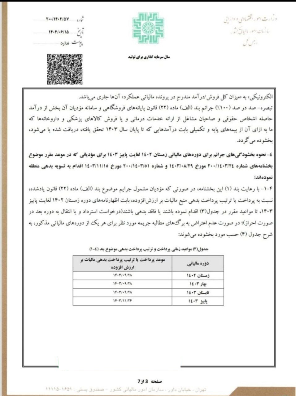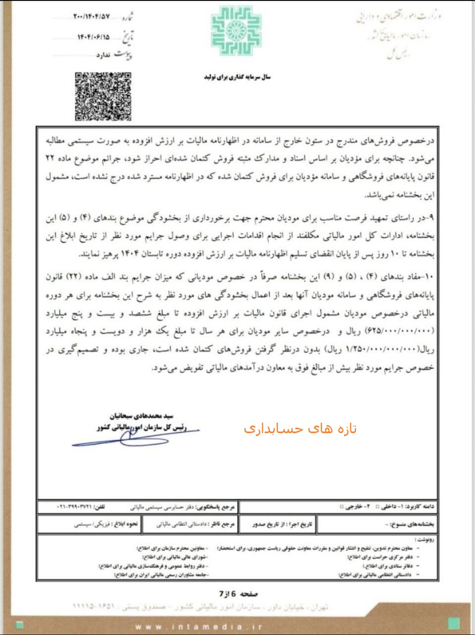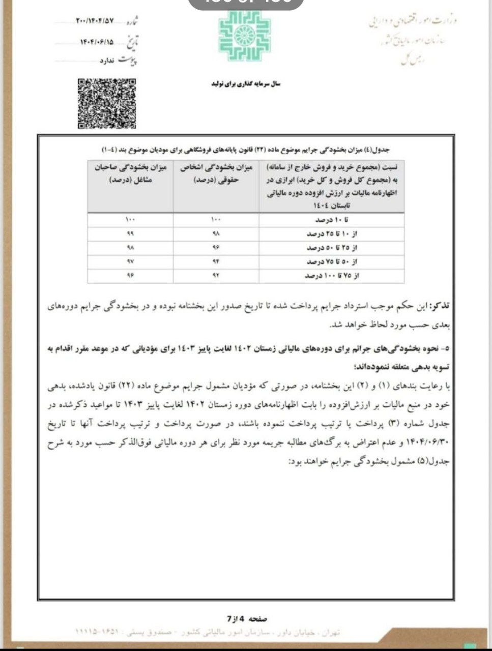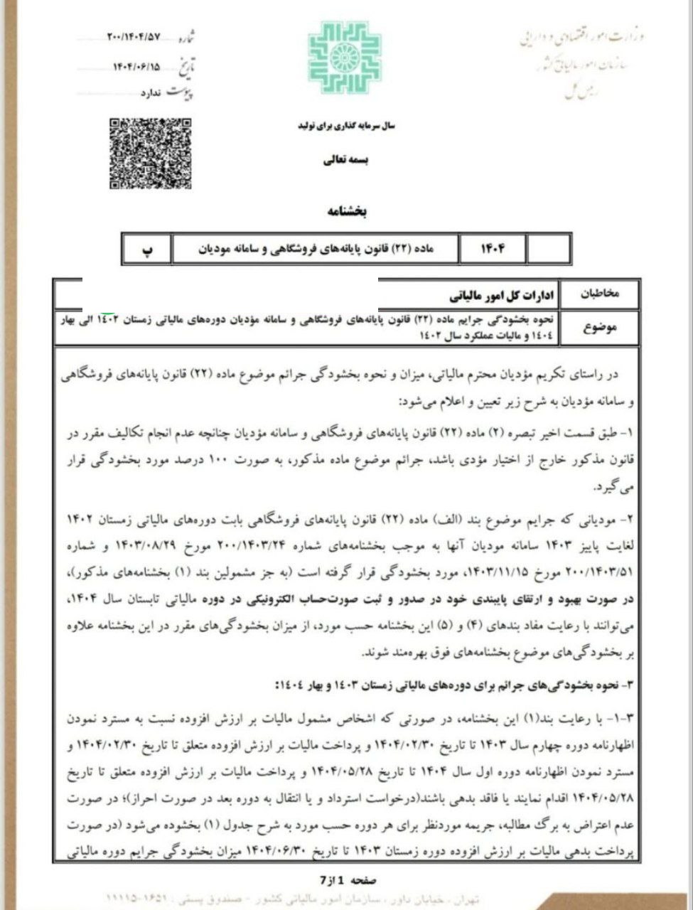 نحوه ی بخشودگی جرایم ماده ۲۲ قانون پایانه های فروشگاهی و سامانه مودیان آيین نامه هاي قانون مالیاتهااخبار برگزیدهاخبار مجامع حرفه اي در شهریور 16, 1404 0 1,133 به اشتراک گذاری سازمان امور مالیاتی در بخشنامه جدیدی نحوه ی بخشودگی جرایم ماده ۲۲ قانون پایانه های فروشگاهی و سامانه مودیان (دوره مالیاتی زمستان۱۴٠٢ الی بهار ۱۴۰۴و مالیات عملکرد سال ۱۴۰۲) را اعلام کرد. بخشودگی جرایمشماره 200/1404/57ماده ۲۲ قانون پایانه های فروشگاهی 0 1,133 به اشتراک گذاری