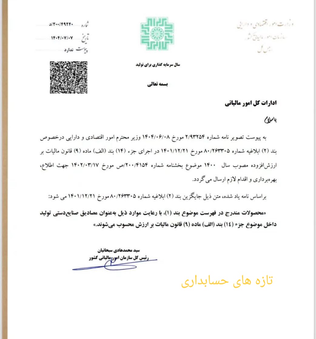 اعلام مصادیق صنایع دستی تولید داخل قانون مالیات بر ارزش افزوده آيین نامه هاي قانون مالیاتهاتازه های امور مالیاتی در مهر 23, 1404 0 73 به اشتراک گذاری مصادیق صنایع دستی تولید داخل موضوع جزء ١۴ بند الف ماده ٩ قانون مالیات بر ارزش افزوده اعلام شد. شماره 200/49240قانون مالیات بر ارزش افزودهمالیات ارزش افزوده صنایع دستی 0 73 به اشتراک گذاری