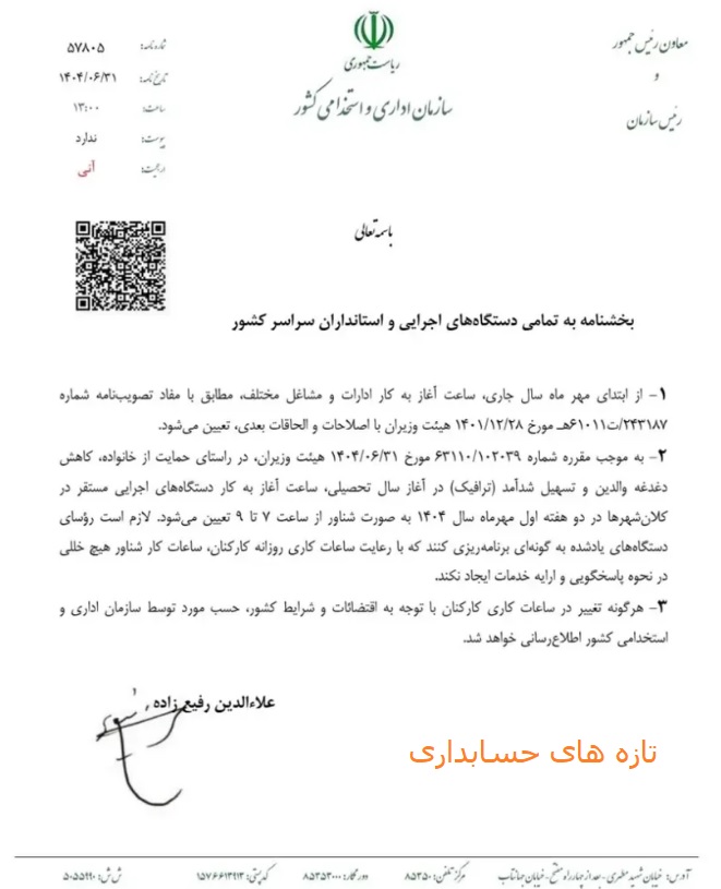 ۳- هرگونه تغییر در ساعات کاری کارکنان با توجه به اقتضائات و شرایط کشور، حسب مورد توسط سازمان اداری و استخدامی کشور اطلاعرسانی خواهد شد.