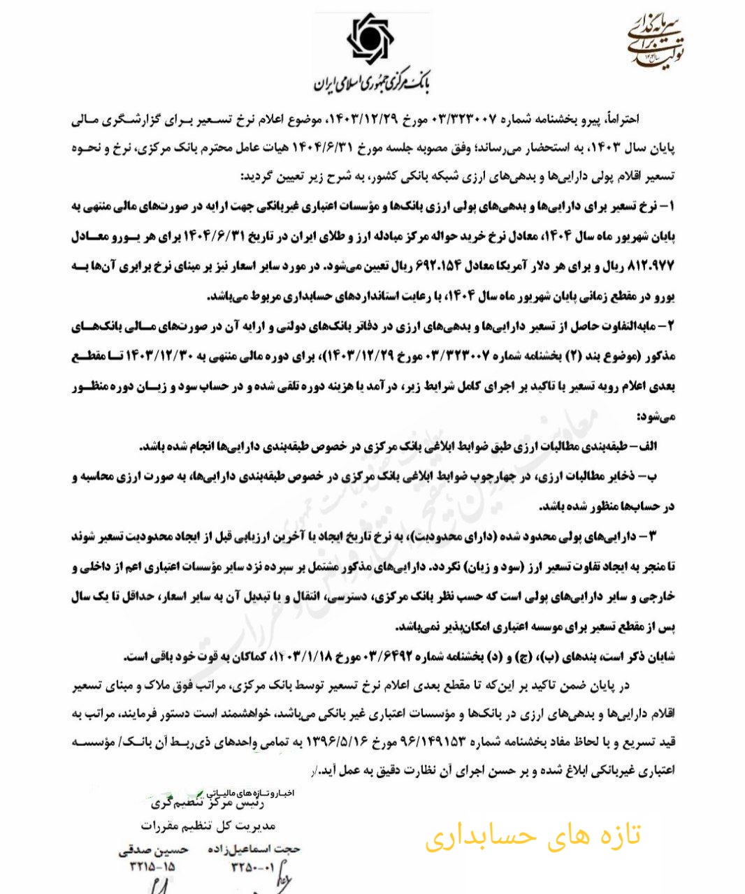 بخشنامه بانک مرکزی درخصوص تعیین نرخ تسعیر اقلام پولی دارایی ها و بدهی های ارزی شبکه بانکی کشور برای گزارشگری مالی پایان سال ۱۴۰۳ با شماره ۰۴/۱۶۴۴۹۵ مورخ ۱۴۰۴/۰۷/۰۸ توسط رئیس مرکز تنظیم گری و مدیریت کل تنظیم مقررات بانک مرکزی جمهوری اسلامی ایران ابلاغ شد.