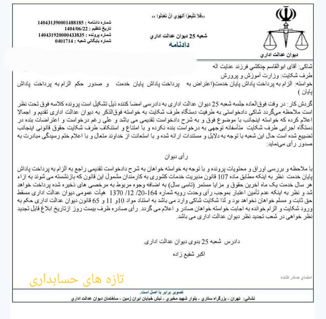 رأی دیوان عدالت اداری در خصوص تأخیر در پرداخت پاداش پایان خدمت فرهنگیان سایر قوانینقوانين عمومي در مهر 6, 1404 0 66 به اشتراک گذاری رأی دیوان عدالت اداری در خصوص تأخیر در پرداخت پاداش پایان خدمت فرهنگیان منتشر شد. تأخیر در پرداخت پاداشدادنامه 8185 0 66 به اشتراک گذاری