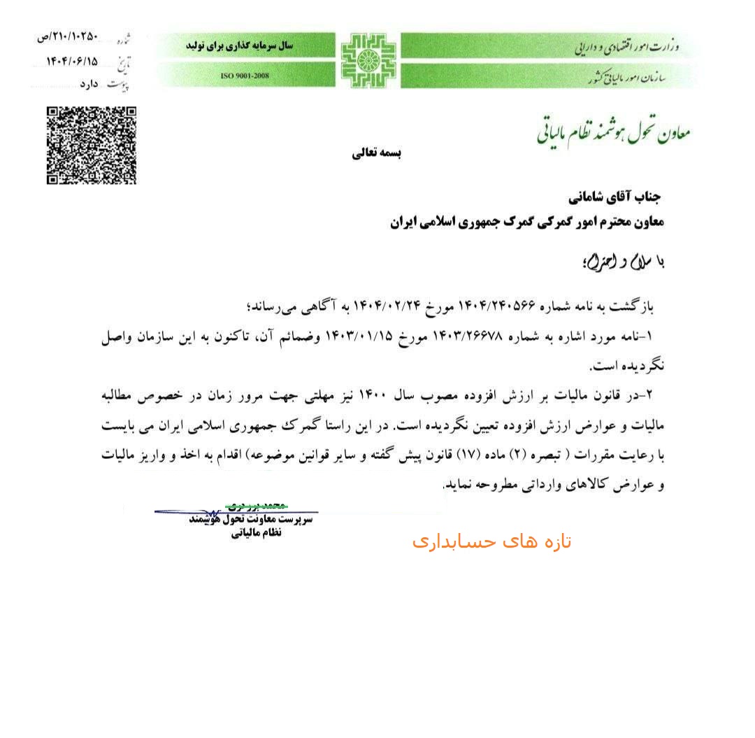 طبق نامه سازمان امور مالیاتی کشور که به گمرک ارسال شده مالیات بر ارزش افزوده مشمول زمان نمیشود.
