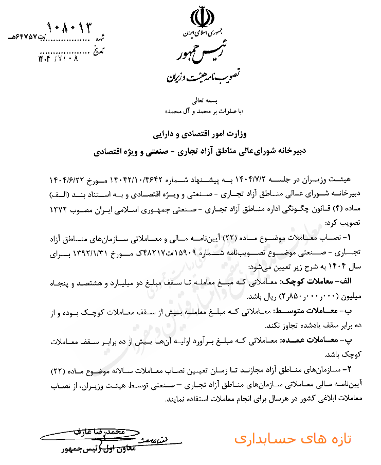 نصاب معاملات سازمان های مناطق آزاد تجاری- صنعتی ابلاغ شد