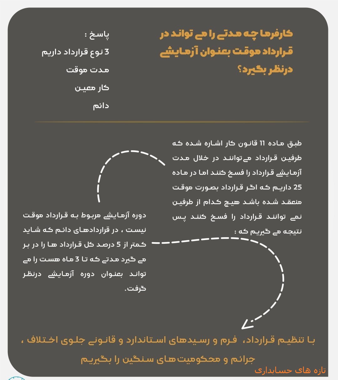 چه مدتی را میتوان دوره آزمایشی در قراردادها در نظر گرفت؟ اخبار برگزیدهاخبار مجامع حرفه ايسایر قوانین در مهر 13, 1404 0 263 به اشتراک گذاری کارفرما چه مدتی میتواند دوره آزمایشی در قراردادها در نظر بگیرد؟ طبق قانون کار، دوره آزمایشی فقط در قراردادهای موقت و حداکثر تا ۳ ماه قابل تعیین است. دوره آزمایشی كارقراردادهای موقت 0 263 به اشتراک گذاری