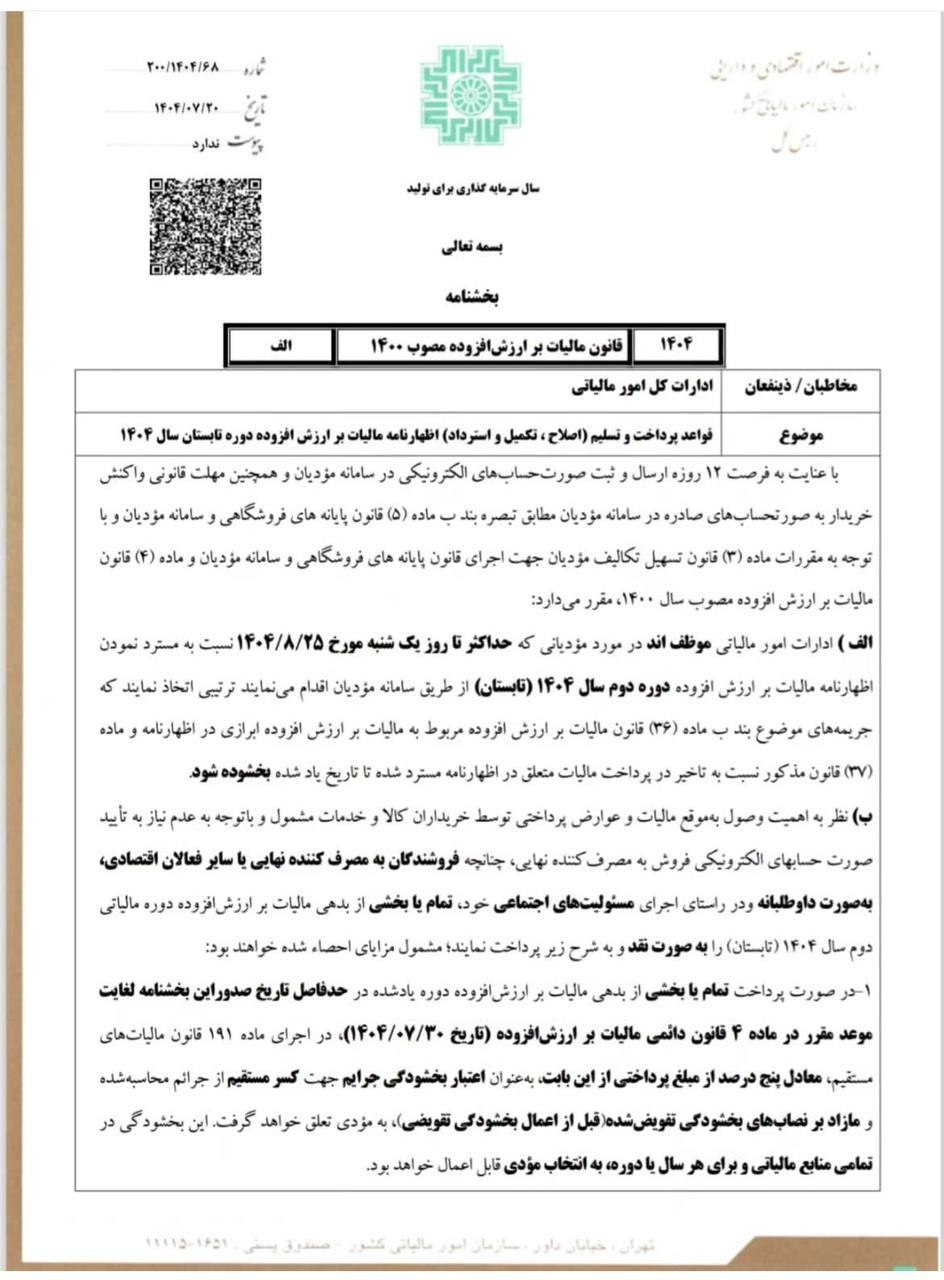 قواعد پرداخت و تسلیم اظهارنامه ارزش افزوده تابستان ۱۴۰۴ شامل امکان ارسال اظهارنامه این دوره تا ۲۵ ابان ماه در بخشنامه سازمان امور مالیاتی تشریح شد.
