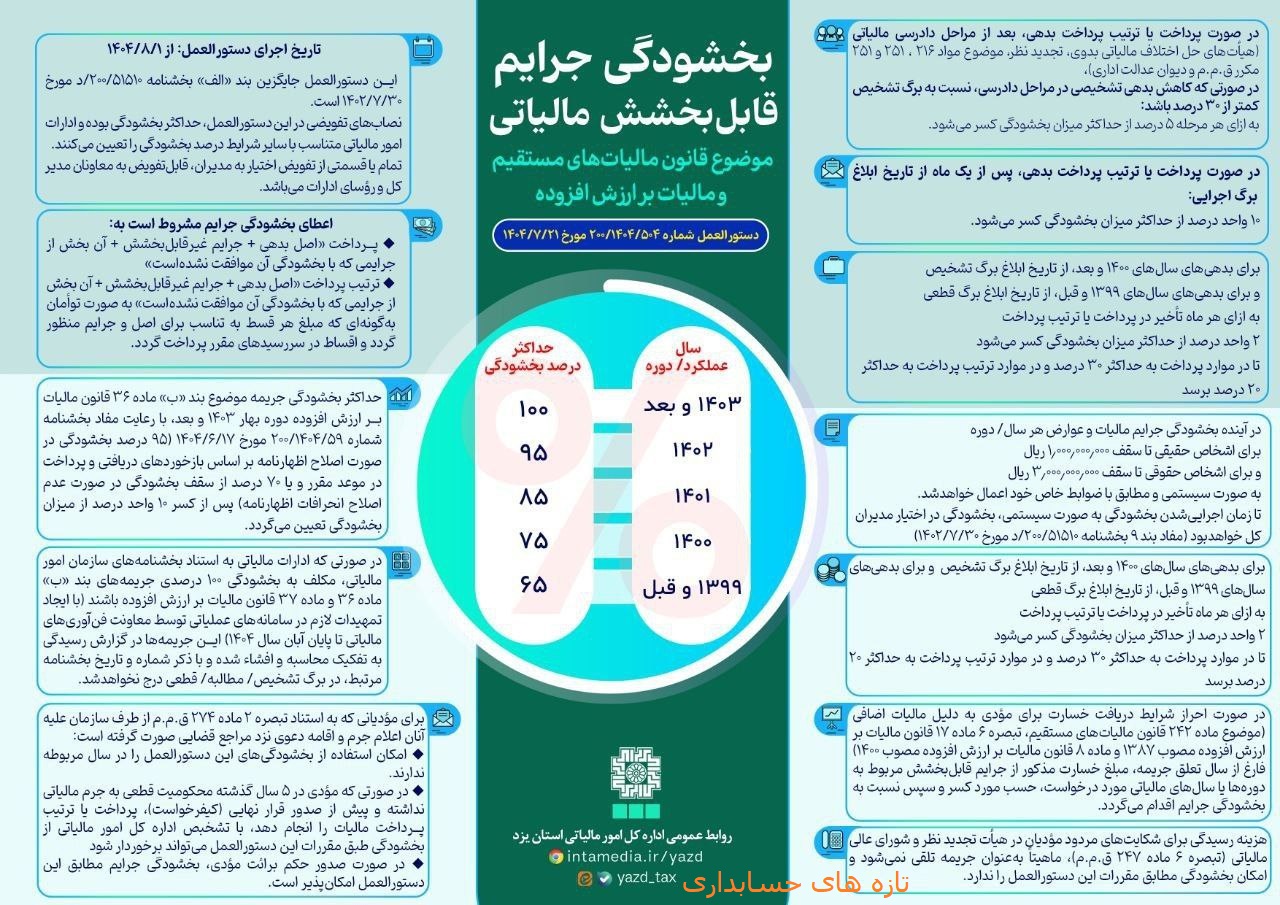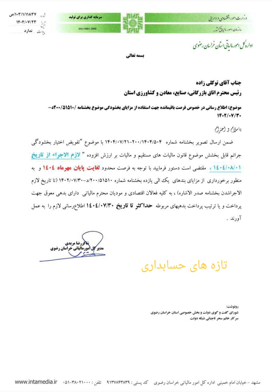 پیرو بخشنامه شماره ۲۰۰/۱۴۰۴/۵۰۴ مورخ ۱۴۰۴/۰۷/۲۱ نحوه استفاده از فرصت نهایی بهره‌مندی از بخشودگی جرایم مالیاتی تا پایان مهرماه ۱۴۰۴ اطلاع رسانی شد.