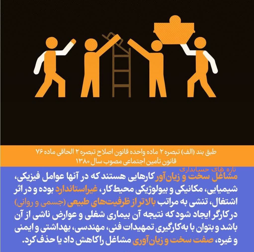 براساس جزء یک بند (الف) تبصره قانونی مذکور مربوط به مشاغل سخت و زیانآور، کارفرمایان کارگاههای مشمول قانون تأمیناجتماعی که تمام یا برخی مشاغل آنها حسب تشخیص مراجع ذیربط، سخت و زیانآور اعلام شده یا خواهد شد، مکلفند ظرف دو سال از تاریخ تصویب این قانون، نسبت به ایمنسازی عوامل شرایط محیط کار مطابق حد مجاز واستانداردهای مشخص شده در قانون کار، آییننامههای مربوطه و سایر قوانین موضوعه در این زمینه اقدام و صفت سخت و زیانآوری کارگاه را حذف کنند.
