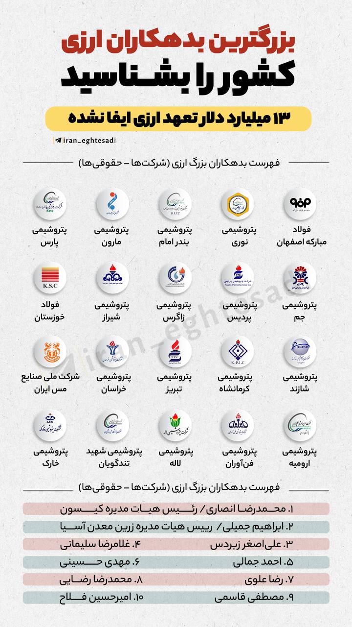عضو کمیسیون اقتصادی مجلس اسامی ۱۰ شخص حقیقی و ۱۰ شرکت که بیشترین عدم بازگشت ارز صادراتی را داشتند، منتشر کرد.