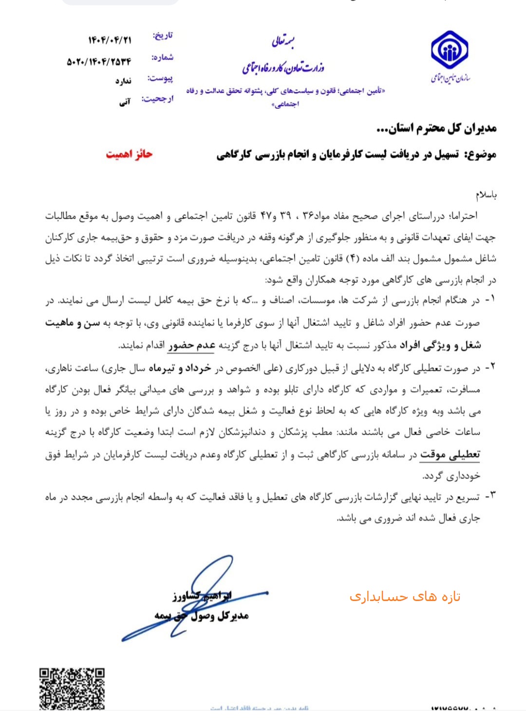 تسهیل در دریافت لیست کارفرمایان و انجام بازرسی کارگاهی اخبار برگزیدهاخبار مجامع حرفه ايبخشنامه تامين اجتماعي در آبان 17, 1404 0 2 به اشتراک گذاری شرایط تسهیل در دریافت لیست کارفرمایان و انجام بازرسی کارگاهی توسط مدیرکل وصول حق بیمه تشریح شد. بازرسی سازمان تامین اجتماعیدریافت صورت مزدشماره 5020/1404/2534قانون تامین اجتماعی 0 2 به اشتراک گذاری