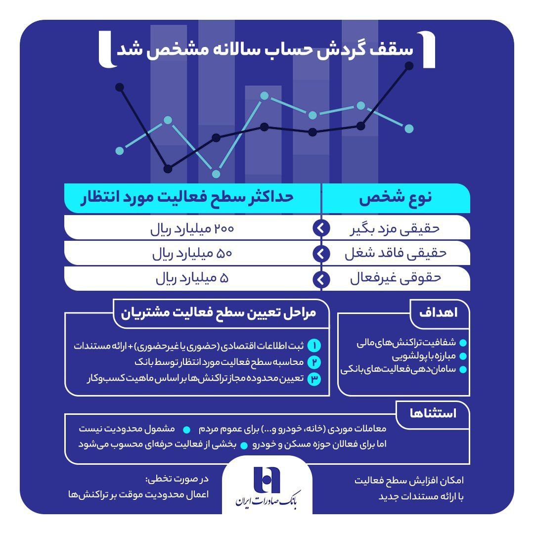 براساس این بخشنامه سقف فعالیت بر اساس نوع مشتری تعیین شده است؛ سقف فعالیت برای مشتریان حقیقی مزدبگیر ۲۰ میلیارد تومان، حقیقی بدون شغل ۵ میلیارد تومان و برای مشتریهای حقوقی غیرفعال ۵۰۰ میلیون تومان است.