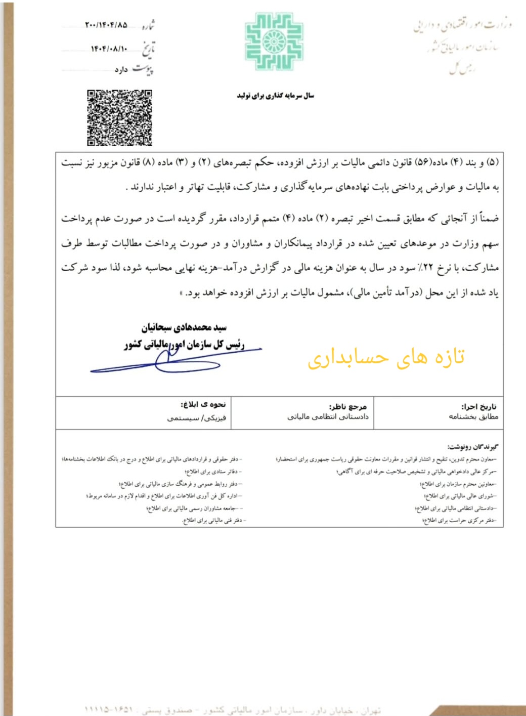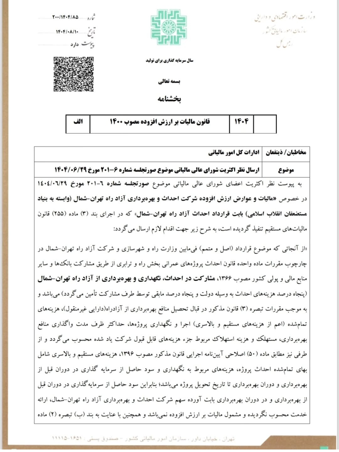 مالیات و عوارض ارزش افزوده شرکت احداث و بهره برداری آزاد راه تهران شمال آيين نامه ماليات ارزش افزودهتازه های امور مالیاتی در آبان 17, 1404 0 4 به اشتراک گذاری نظر اکثریت شورای عالی مالیاتی موضوع صورت جلسه شماره ۶-۲۰۱ مورخ ۱۴۰۴/۰۶/۲۹ در خصوص مالیات و عوارض ارزش افزوده شرکت احداث و بهره برداری آزاد راه تهران شمال ارسال شد. شماره 200/1404/85مالیات آزاد راه 0 4 به اشتراک گذاری