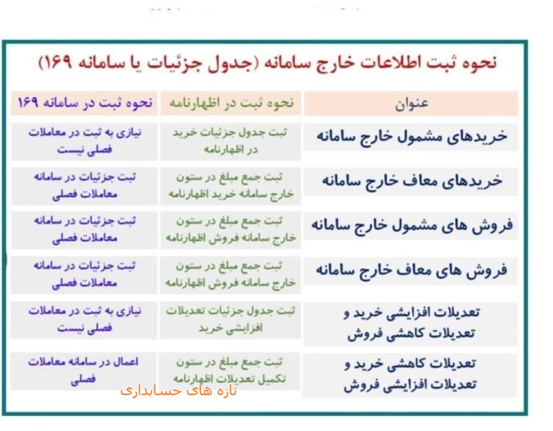 نحوه ثبت اطلاعات خارج از سامانه مودیان اخبار امور مالياتياخبار مجامع حرفه اي در آبان 16, 1404 0 5 به اشتراک گذاری نحوه ثبت اطلاعات خارج از سامانه مودیان(جدول جزئیات یا سامانه ۱۶۹) بدین شرح می باشد: خریدهای مشول خارج از سامانهخریدهای معاف خارج از سامانهسامانه 169صورتحساب های کاهندهفروش های مشول خارج از سامانهفروش های معاف خارج از سامانهمعاملات فصلیمعاملات موضوع ماده ۱۶۹ 0 5 به اشتراک گذاری
