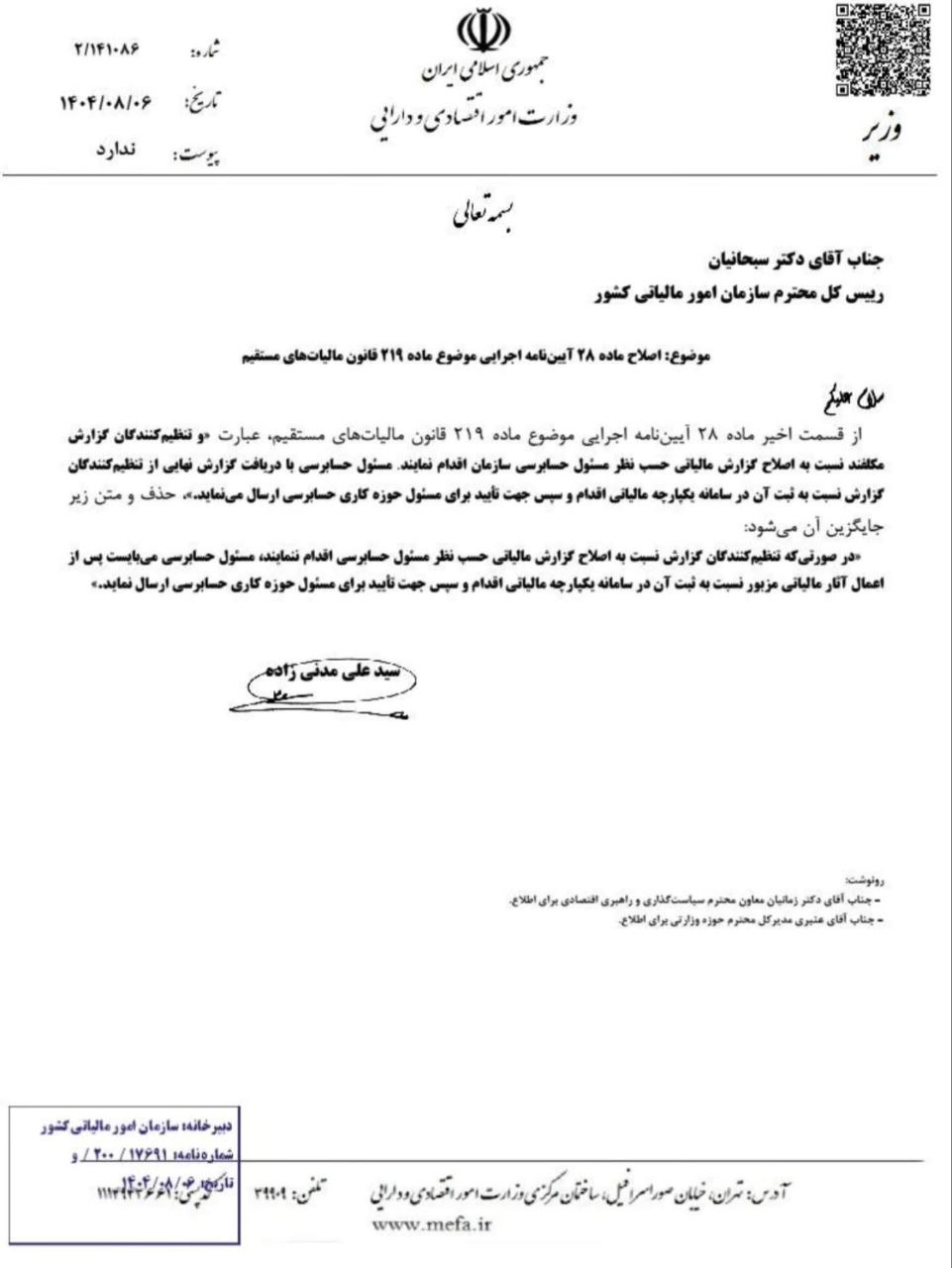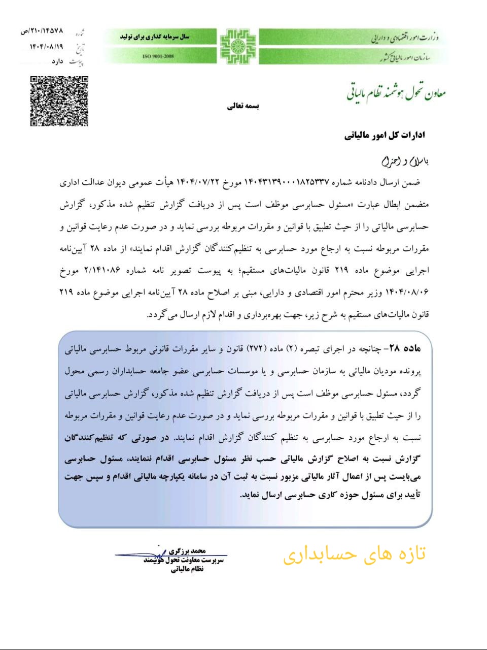 اصلاح ماده ۲۸ آیین نامه اجرایی ماده ۲۱۹ قانون مالیاتها تازه های امور مالیاتی در آبان 21, 1404 0 4 به اشتراک گذاری دادنامه شماره ۱۴۰۴۳۱۳۹۰۰۰۱۸۲۵۳۳۷ مورخ ۱۴۰۴/۰۷/۲۲ هیأت عمومی دیوان عدالت اداری موضوع اصلاح ماده ۲۸ آیین نامه اجرایی موضوع ماده ۲۱۹ قانون مالیاتهای مستقیم ارسال شد. تبصره ۲ ماده ۲۷۲ قانون مالیاتهادادنامه 5337شماره 141086شماره 210/14578گزارش حسابرسیگزارش مالیاتی 0 4 به اشتراک گذاری