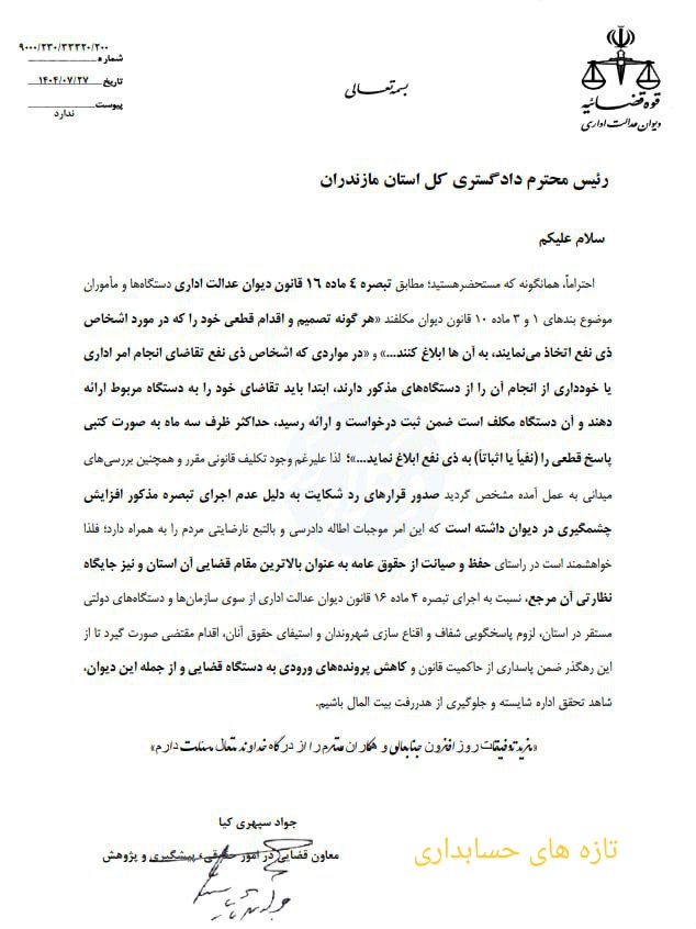 لزوم رعایت تبصره ۴ ماده ۱۶ قانون دیوان عدالت اداری از سوی سازمان ها و دستگاه های دولتی سایر قوانینقوانين عمومي در آبان 21, 1404 0 0 به اشتراک گذاری معاون قضایی در امور حقوقی، پیشگیری و پژوهش دیوان عدالت اداری در بخشنامه ای بر لزوم رعایت تبصره ۴ ماده ۱۶ قانون دیوان عدالت اداری از سوی سازمان ها و دستگاه های دولتی تاکید کرد. دیوان عدالت اداریشماره 230/33320/200 0 0 به اشتراک گذاری