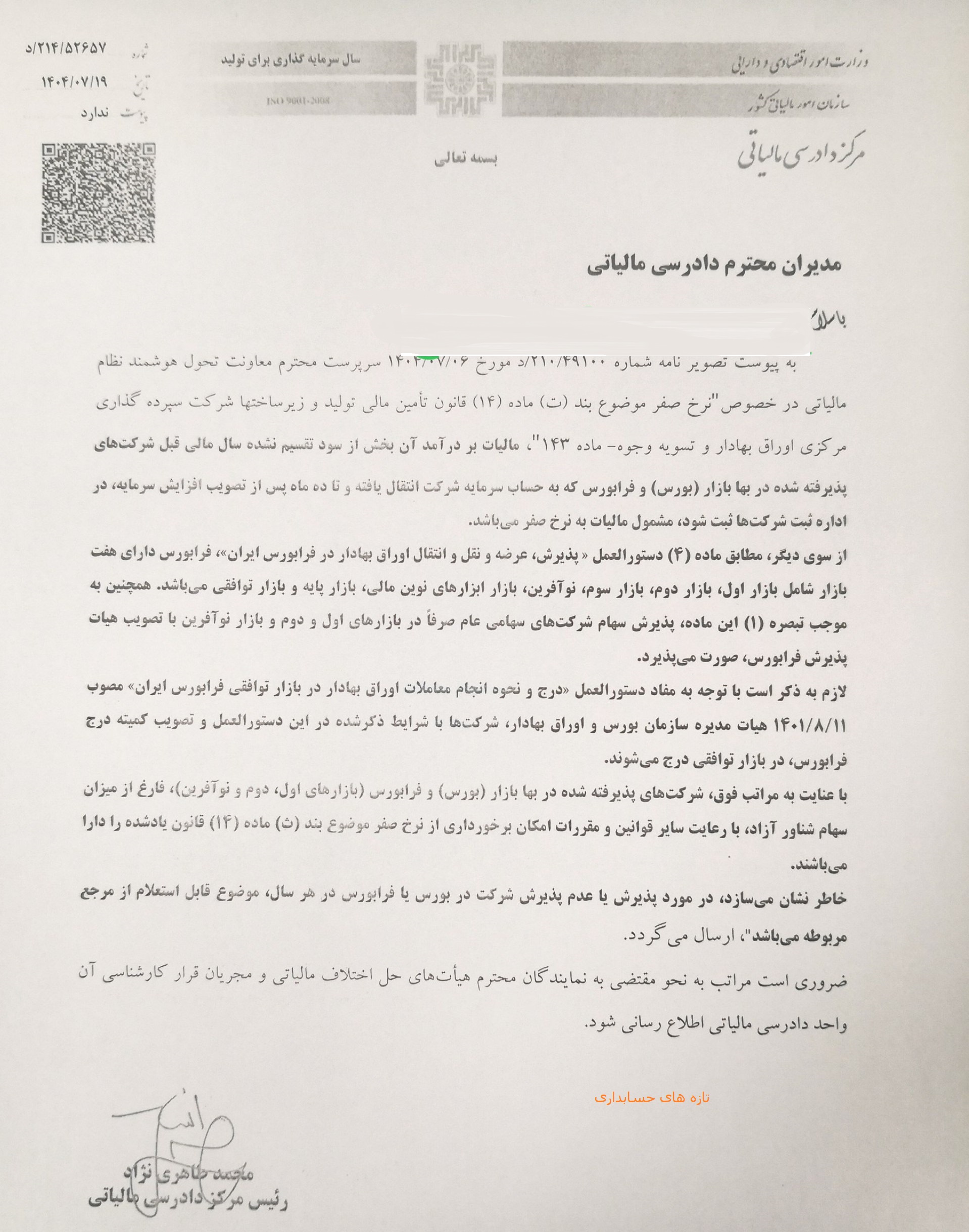 نرخ صفر شرکت سپردهگذاری پذیرفته شده در بورس آيین نامه هاي قانون مالیاتهاتازه های امور مالیاتی در آبان 16, 1404 0 4 به اشتراک گذاری بموجب مکاتبه مرکز دادرسی مالیاتی شرایط اعمال نرخ صفر موضوع بند(ت) ماده ١۴ قانون تامین مالی تولید و زیرساختها شرکت سپردهگذاری پذیرفته شده در بورس اعلام شد. بخشنامه مالیاتیشماره 214/52657نرخ صفر 0 4 به اشتراک گذاری