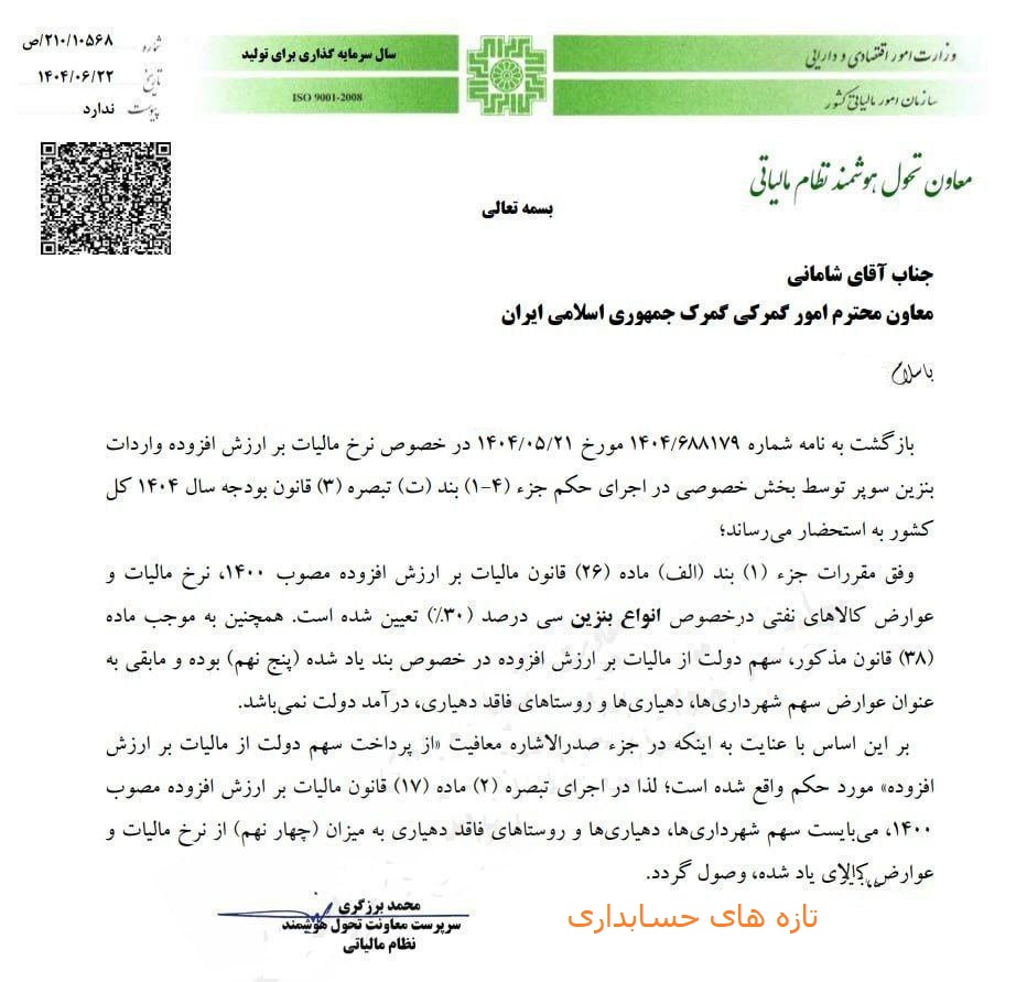 ️در نامه سازمان مالیاتی به گمرک نرخ مالیات و عوارض کالاهای نفتی در خصوص بنزین ۳۰ درصد اعلام شد. در این نامه آمده است: