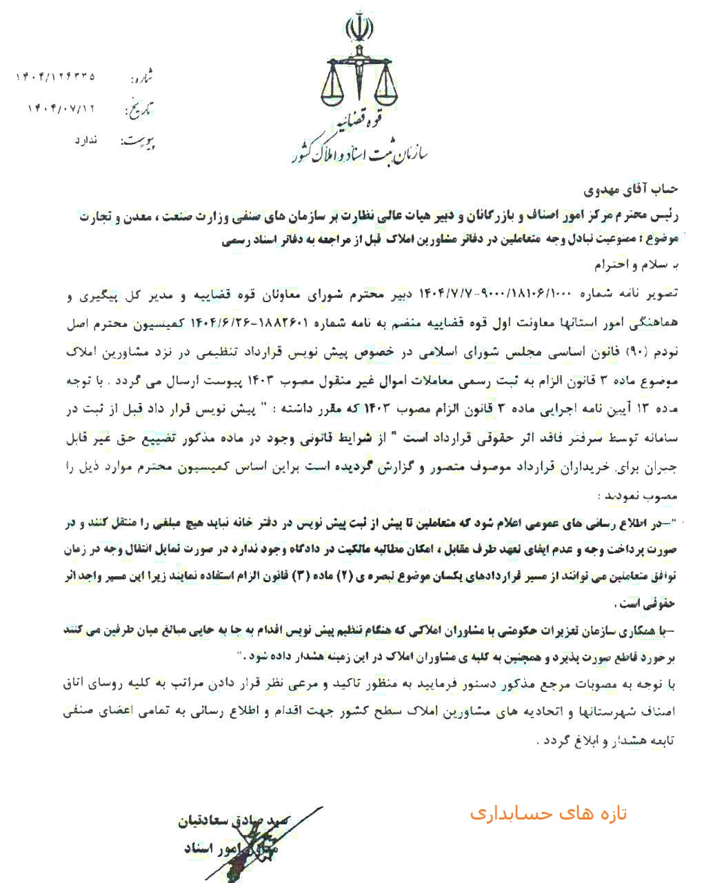 تصویر نامه شماره ۹۰۰۰/۱۸۱۰۶/۱۰۰۰ – ۱۴۰۴/۷/۷ دبیر محترم شورای معاونان قوه قضاییه و مدیر کل پیگیری و هماهنگی امور استانها معاونت اول قوه قضاییه منضم به نامه شماره ۱۸۸۲۶۰۱- ۱۴۰۴/۶/۲۶ کمیسیون محترم اصل نودم (۹۰) قانون اساسی مجلس شورای اسلامی در خصوص پیش نویس قرارداد تنظیمی در نزد مشاورین املاک موضوع ماده ۳ قانون الزام به ثبت رسمی معاملات اموال غیر منقول مصوب ۱۴۰۳ پیوست ارسال می گردد. با توجه ماده ۱۳ آیین نامه اجرایی ماده ۳ قانون الزام مصوب ۱۴۰۳ که مقرر داشته: «پیش نویس قرار داد قبل از ثبت در سامانه توسط سرفتر فاقد اثر حقوقی قرارداد است» از شرایط قانونی وجود در ماده مذکور تضییع حق غیر قابل جبران برای خریداران قرارداد موصوف منصور و گزارش گردیده است بر این اساس کمیسیون محترم موارد ذیل را مصوب نمودند: