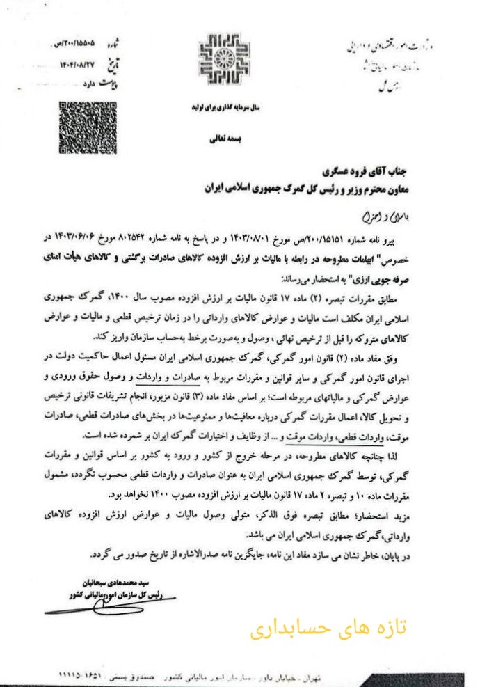 چنانچه کالاهای مطـروحه ، در مرحله خروج از کشـور و ورود به کشـور بر اساس قوانین و مقـررات گمرکی ، توسط گمرک جمهـوری اسلامی ایران به عنوان صـادرات و واردات قطعی محسـوب نگـردد ، مشمول مقــررات ماده ۱۰ و تبصــره ۲ ماده ۱۷ قانون مالیــات بر ارزش افـزوده مصـوب ۱۴۰۰ نخواهـد بود.