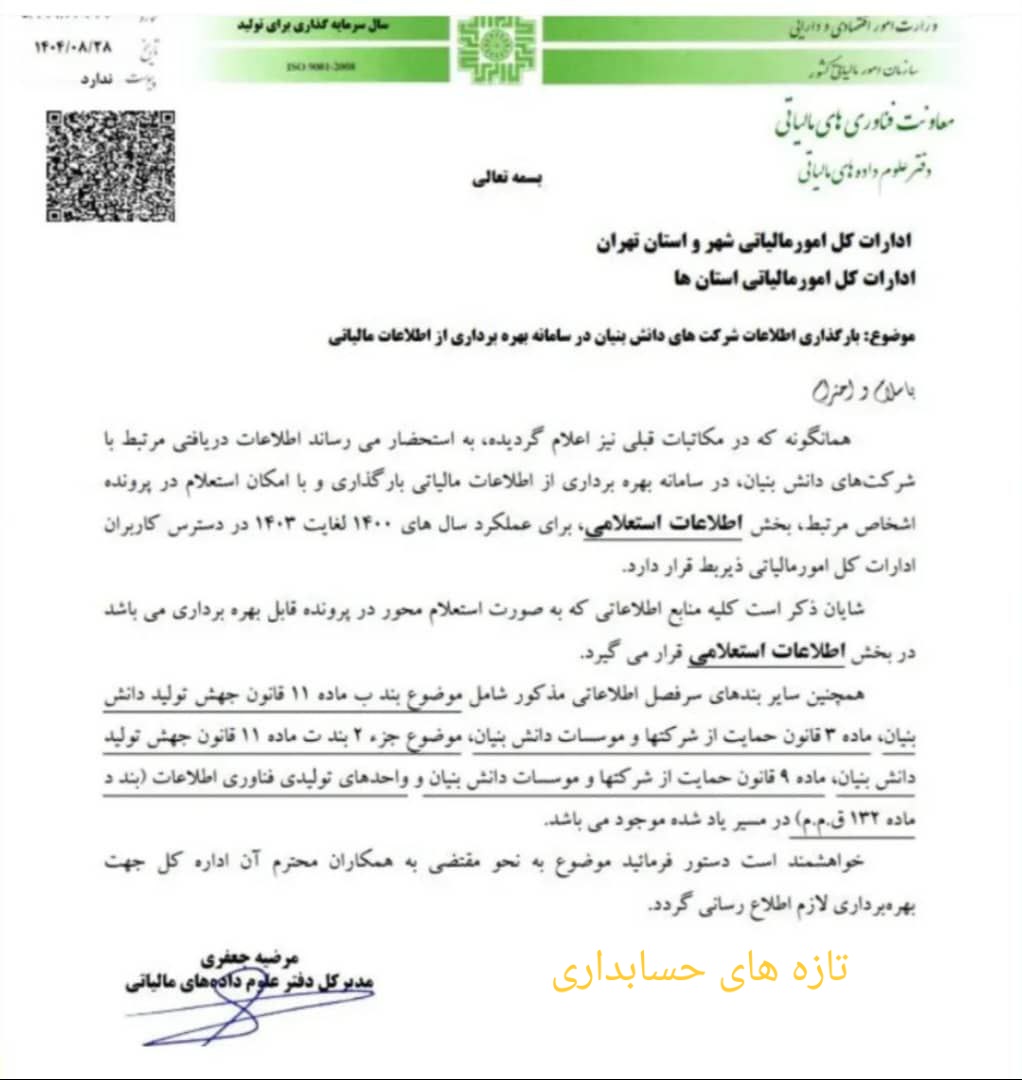 بارگذاری اطلاعات شرکت های دانش بنیان در سامانه بهره برداری از اطلاعات مالیاتی آيین نامه هاي قانون مالیاتهاتازه های امور مالیاتی در آذر 5, 1404 0 4 به اشتراک گذاری اطلاعات شرکت های دانش بنیان در سامانه بهره برداری از اطلاعات مالیاتی بارگذاری شد. اطلاعات مالیاتیمالیات شرکت های دانش بنیان 0 4 به اشتراک گذاری