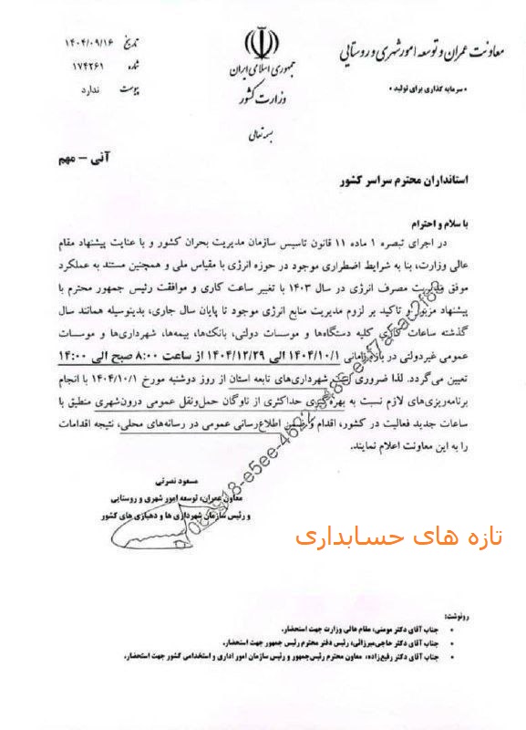 در اجرای تبصره ۱ ماده ۱۱ قانون تأسیس سازمان مدیریت بحران کشور و با عنایت به پیشنهاد مقام عالی وزارت، بنا به شرایط اضطراری موجود در حوزه انرژی با مقیاس ملی و همچنین مستند به عملکرد موفق مدیریت مصرف انرژی در سال ۱۴۰۳ با تغییر ساعت کاری و موافقت رئیس جمهور محترم با پیشنهاد مزبور و تأکید بر لزوم مدیریت منابع انرژی موجود تا پایان سال جاری، بدینوسیله همانند سال گذشته ساعات کاری کلیه دستگاهها و مؤسسات دولتی، بانکها، بیمهها، شهرداریها و مؤسسات عمومی غیردولتی در بازه زمانی ۱۴۰۴/۱۰/۱ الی ۱۴۰۴/۱۲/۲۹ از ساعت ۸:۰۰ صبح الی ۱۴:۰۰ تعیین میگردد.