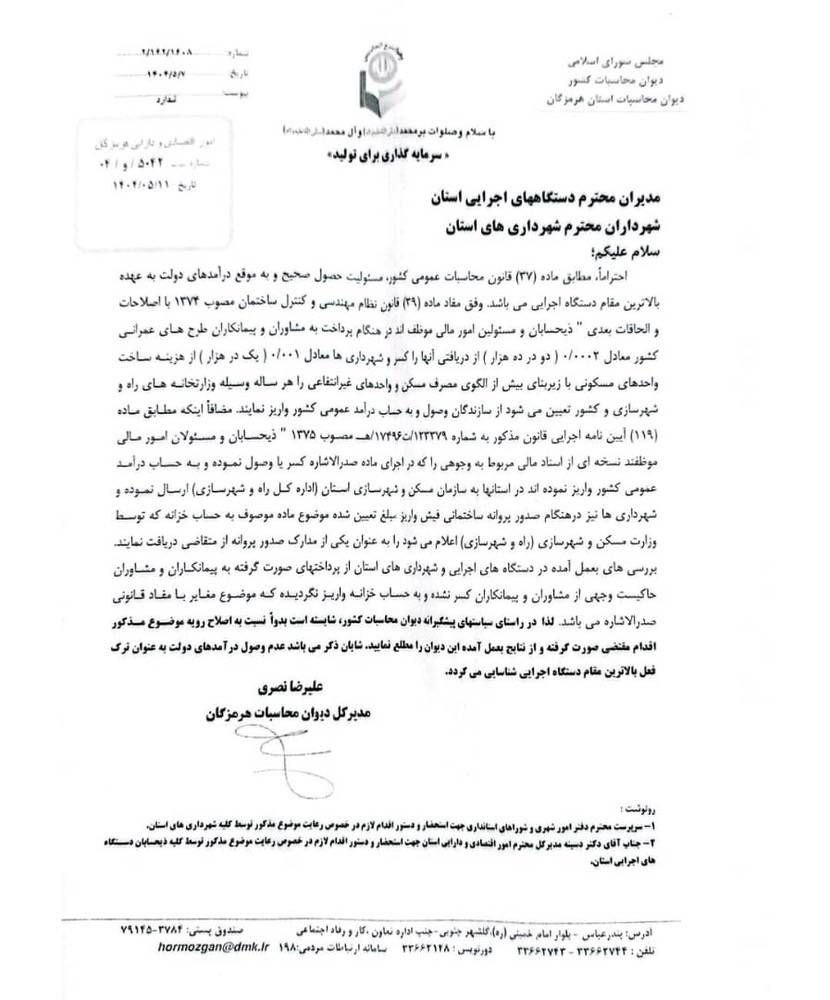لزوم کسر ۲ در ده هزارماده ۳۹ قانون نظام مهندسی سایر قوانینقوانين عمومي در آذر 27, 1404 0 65 به اشتراک گذاری برلزوم کسر ۲ در ده هزارماده ۳۹ قانون نظام مهندسی در کلیه دستگاههای اجرایی از صورت وضعیت های عمرانی و واریز به حساب درآمد عمومی کشورتاکید شد. شایان ذکر است عدم وصول درآمدهای دولت به عنوان ترک فعل بالاترین مقام دستگاه اجرایی شناسایی می گردد. ترک فعلشماره 1608شماره 40431قانون محاسبات عمومی کشور 0 65 به اشتراک گذاری