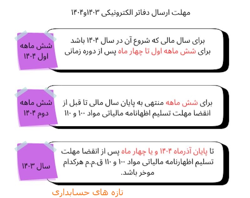 مهلت ارسال دفاتر الکترونیکی سال ۱۴۰۳ و ۱۴۰۴ مطابق بخشنامه ۲۱٠/۱۴۸۹۹/ص تاریخ ۱۴٠۴/٠۸/۲۱ بدین شرح می باشد: