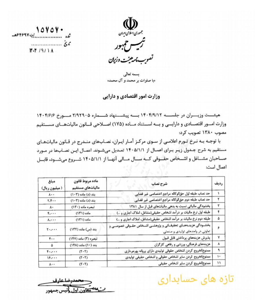 بموجب مصوبه هیات دولت، نصاب های مندرج در قانون مالیاتهای مستقیم ب استناد ماده ۱۷۵(لازم الاجرا از تاریخ ۱۴۰۵/۰۱/۰۱)تعدیل شد.